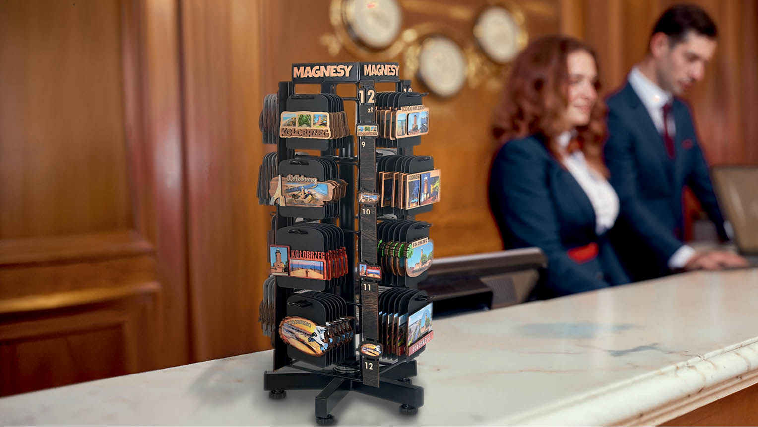 Para la serie hotelera hemos diseñado un nuevo expositor ligero y elegante que ocupa poco espacio y al mismo tiempo decora la recepción del hotel. Su diseño moderno, alta calidad y estilo refinado hacen que la exposición de imanes se convierta en una parte integral del interior del hotel.